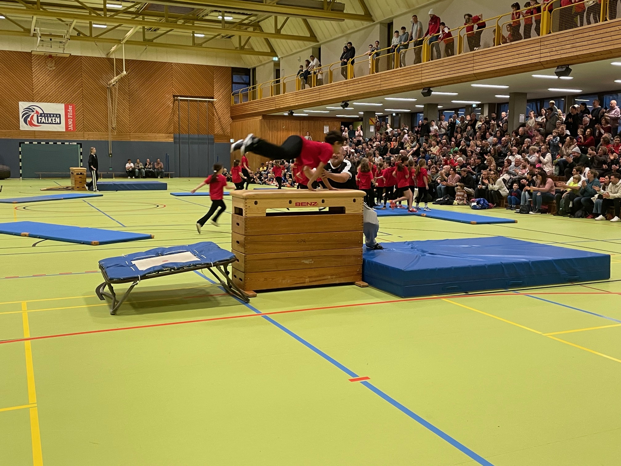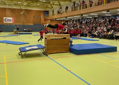 Die Himmelsstürmer der Trampolinabteilung, unter der Leitung von Katharina F., Katharina R. und Emily, bildete den krönenden Abschluss der Vorführungen. Sie zeigten eindrucksvoll, warum sie auch im Jahr 2025 zahlreiche Medaillen gewonnen haben. In diesem Jahr gab es zudem wieder einen Flashmob zu „Macarena Christmas“, organisiert von Natascha Mainiero, der sogar viele Eltern dazu animierte, nach dem langen Sitzen auf die Hallenfläche zu kommen, um sich zu bewegen. Auch auf der Tribüne wurde fleißig mitgetanzt und geklatscht.