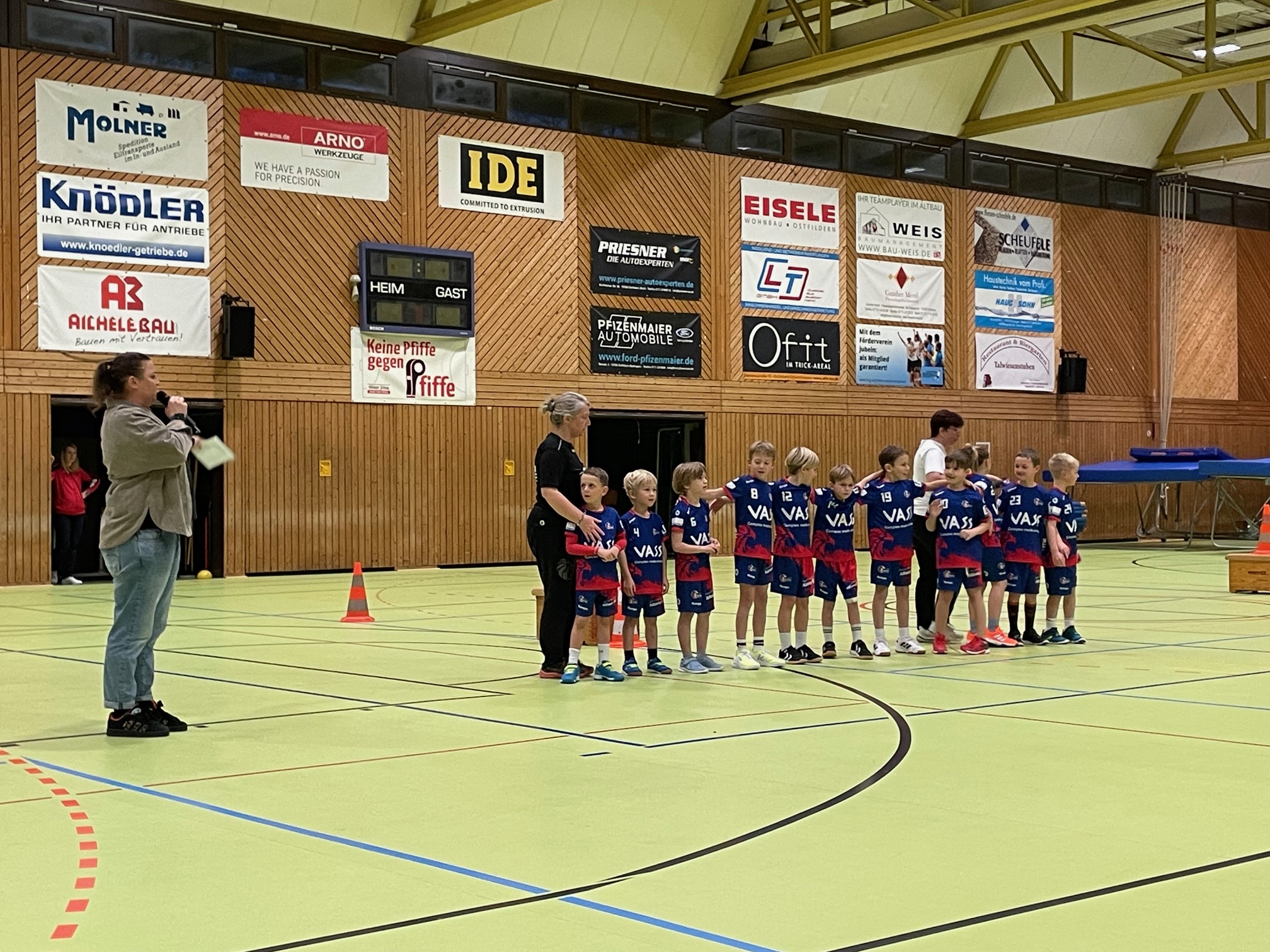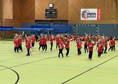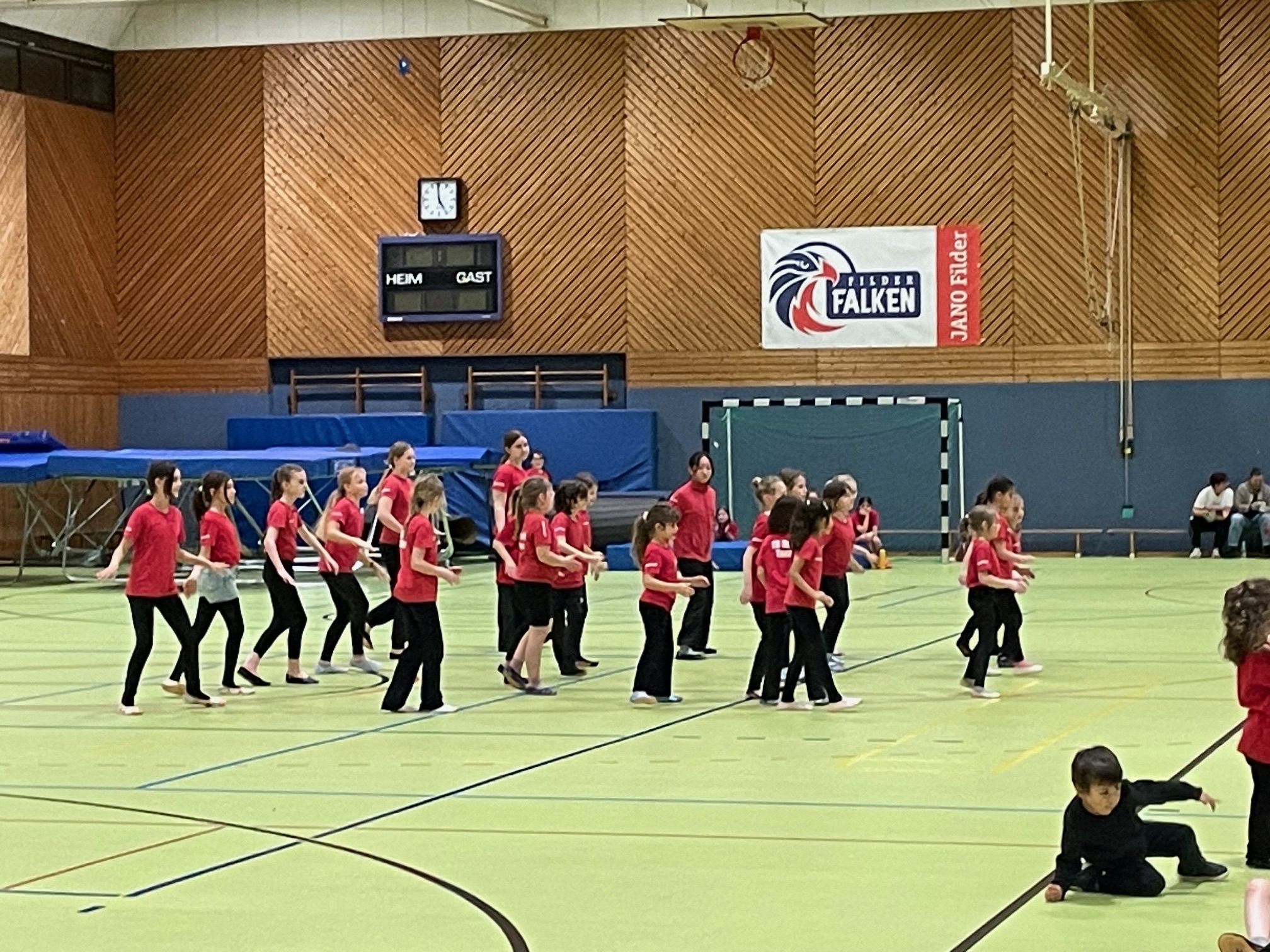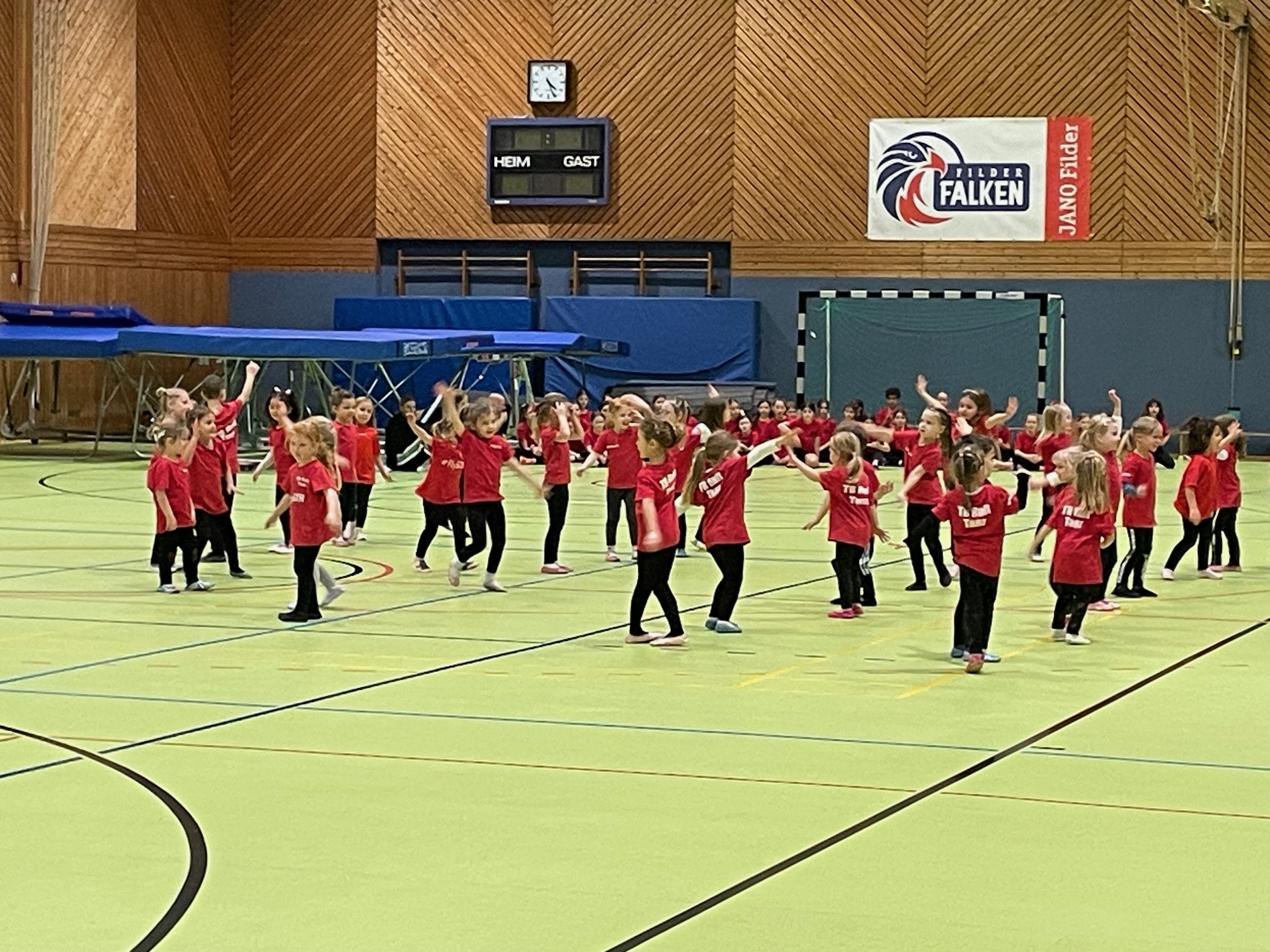 Zunächst präsentierten sich die Turnmädels unter der Leitung von Jochen Schneider, Leni Mollenhauer und Niklas Minkenberg. Die Kleinsten der Tanzmädels, die Mini Stars, begeisterten mit einem schwungvollen Tanz. Darauf folgte die F-Jugend der Jano Filderfalken. Sie wurden professionell, wie bei einem Bundesligaspiel von Ania Rösler angekündigt. Die Filderfalken zeigten, wie geschickt sie bereits mit dem Handball umgehen können. Trainiert werden sie von Regina Müller und Corina Distel. Die Maxi Stars zeigten ihr Können mit einem temporeichen Tanz.